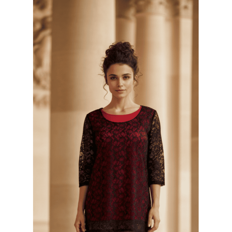 - дамска блуза от черна дантела с червена основа, подходяща за по-официален повод