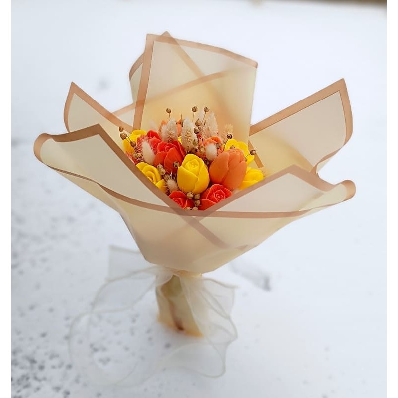 - ръчно изработен букет от лалета с добавени сухи треви, опакован в нежна бледо жълта хартия и с панделка от органза