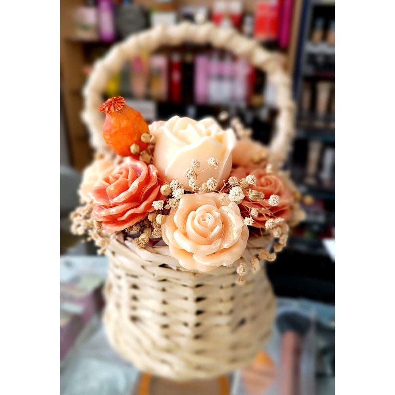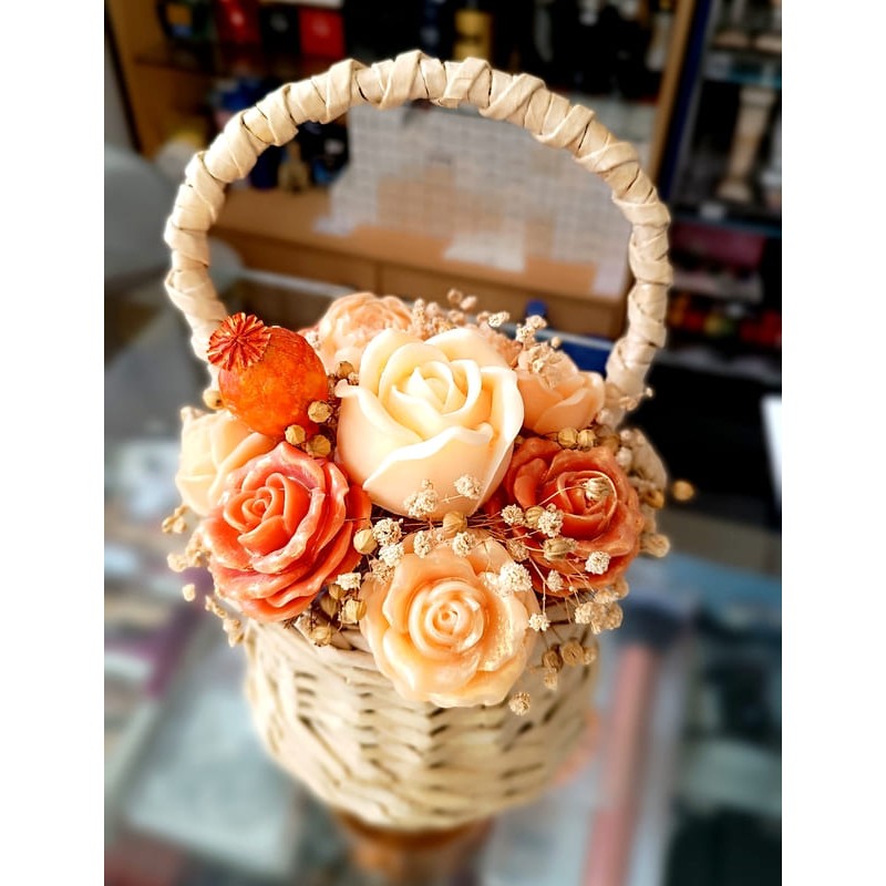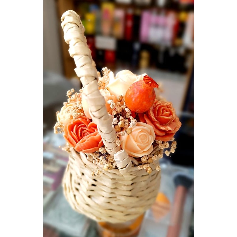 - красив букет от восъчни соеви цветя в ръчно плетена кошница тип менче