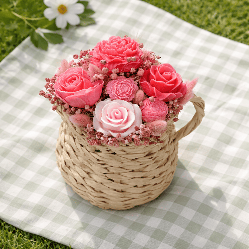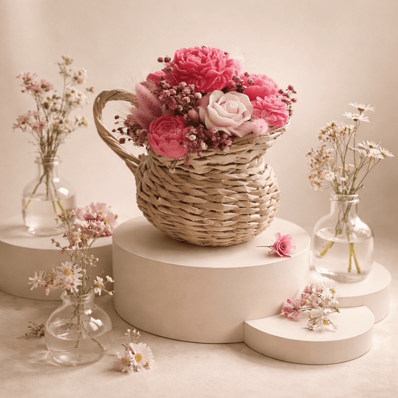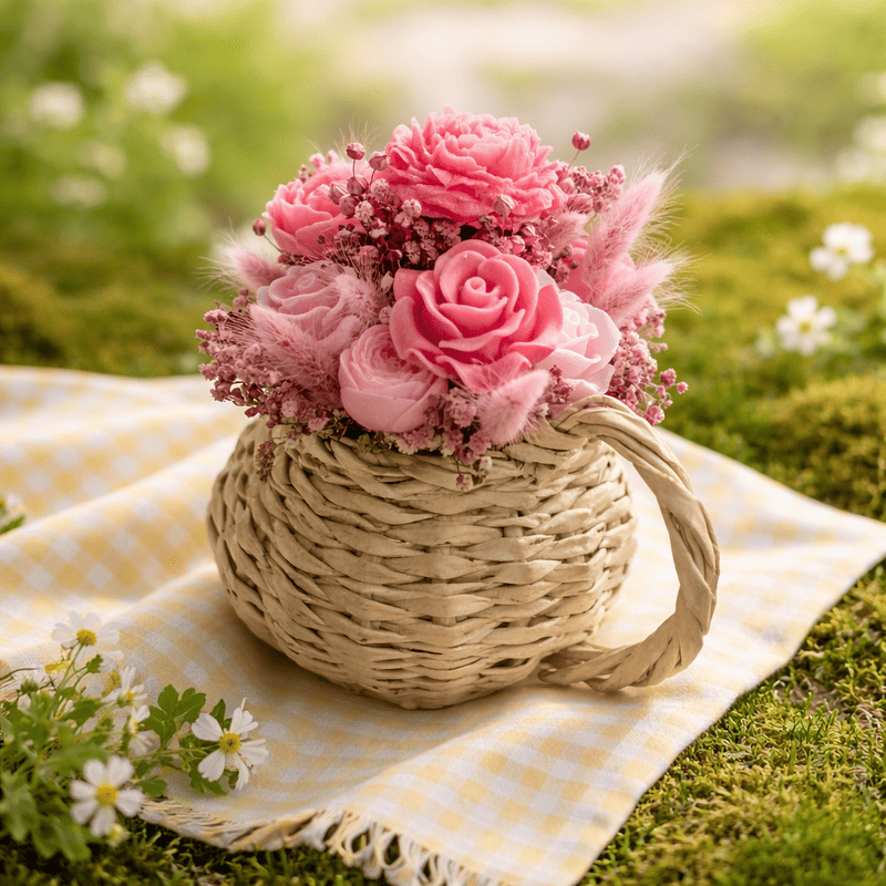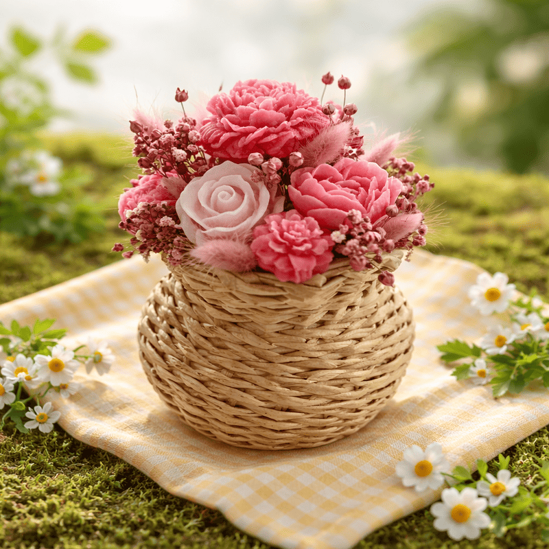 Букет от восъчни цветя в плетена кана за подарък