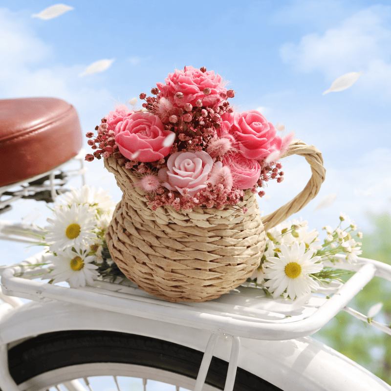 - красив букет от цветя от соев восък аранжирани в ръчно плетена кашпа тип кана