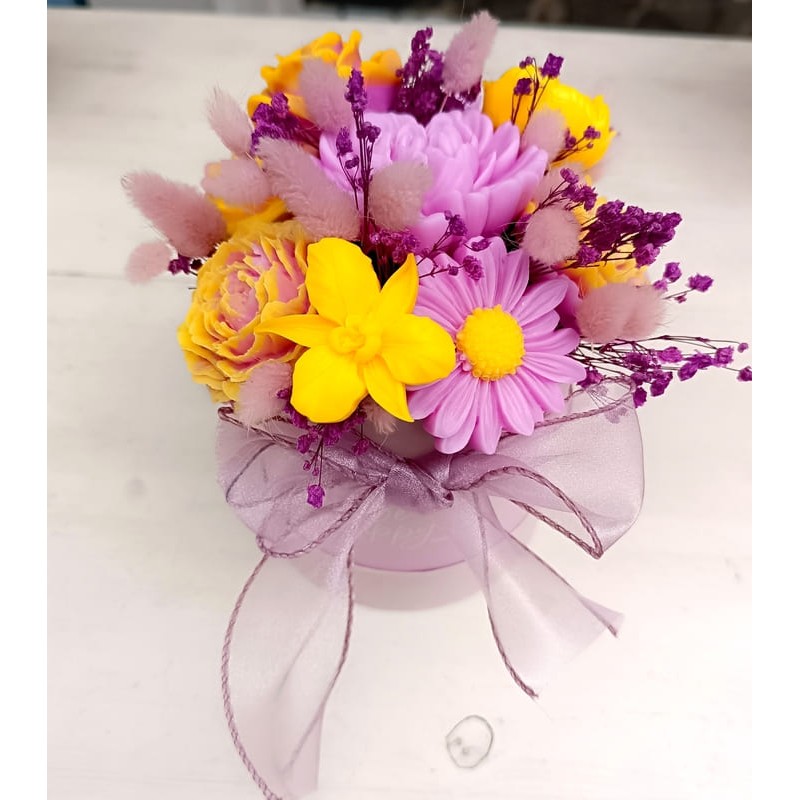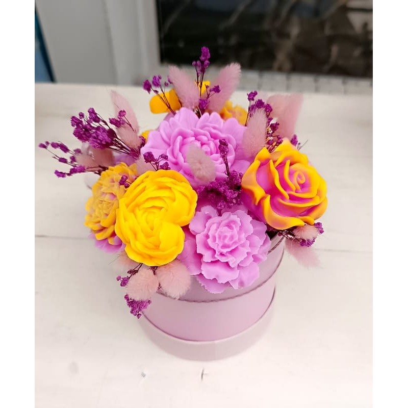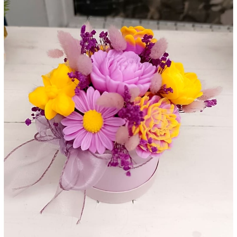 Букет соеви цветя в кръгла кутия за рожден ден на дамаРазмери: диаметър на кутията 11 см, височина 3..