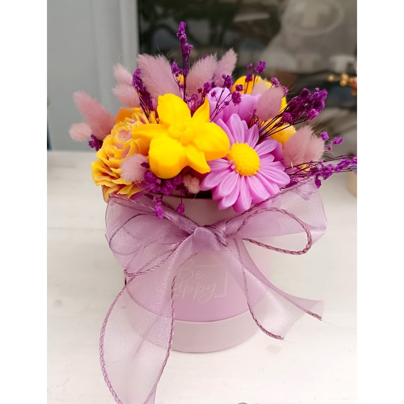 Букет от соеви цветя в кутия за 8 Март или рожден денРазмери: диаметър на кутията 11 см, височина 30..