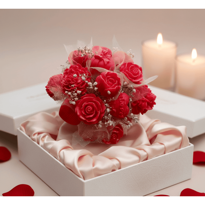 Букет от свещи в кутия за подарък за скъп човекАранжирани соеви цветя в кутия, изработени с много лю..