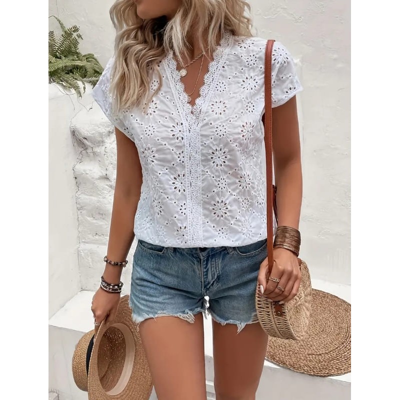 - дамска леко вталена лятна блуза от материя тип английска дантела