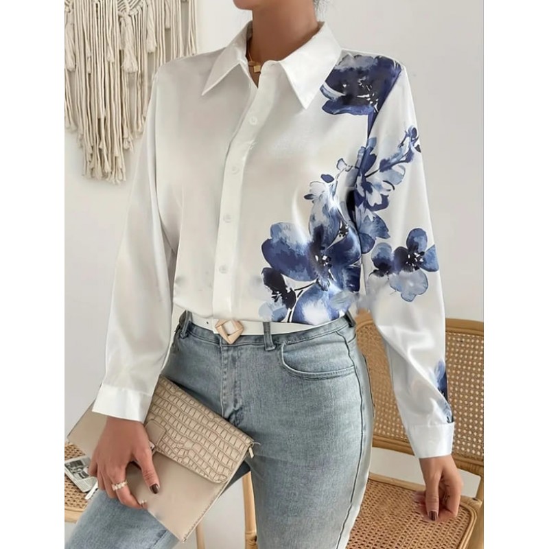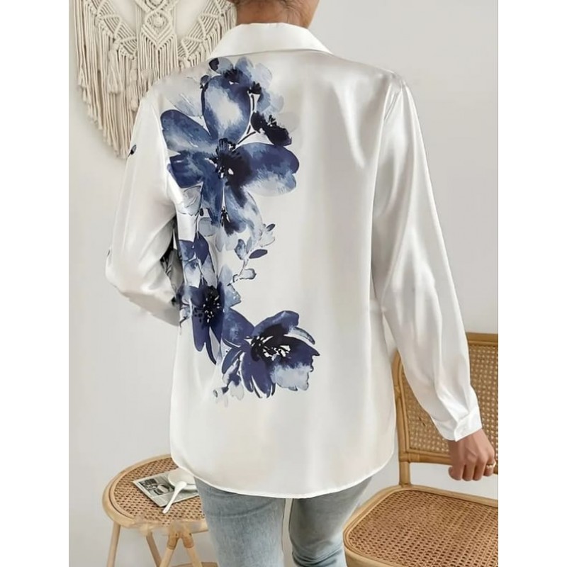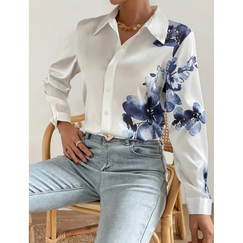Бяла риза с асиметрична щампа цветя от сатен