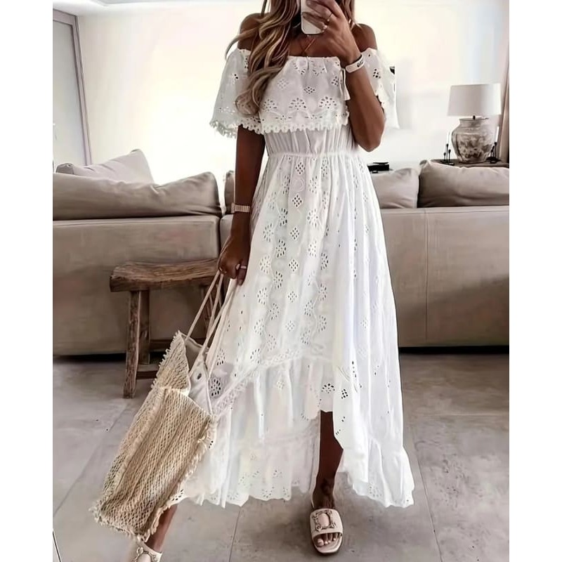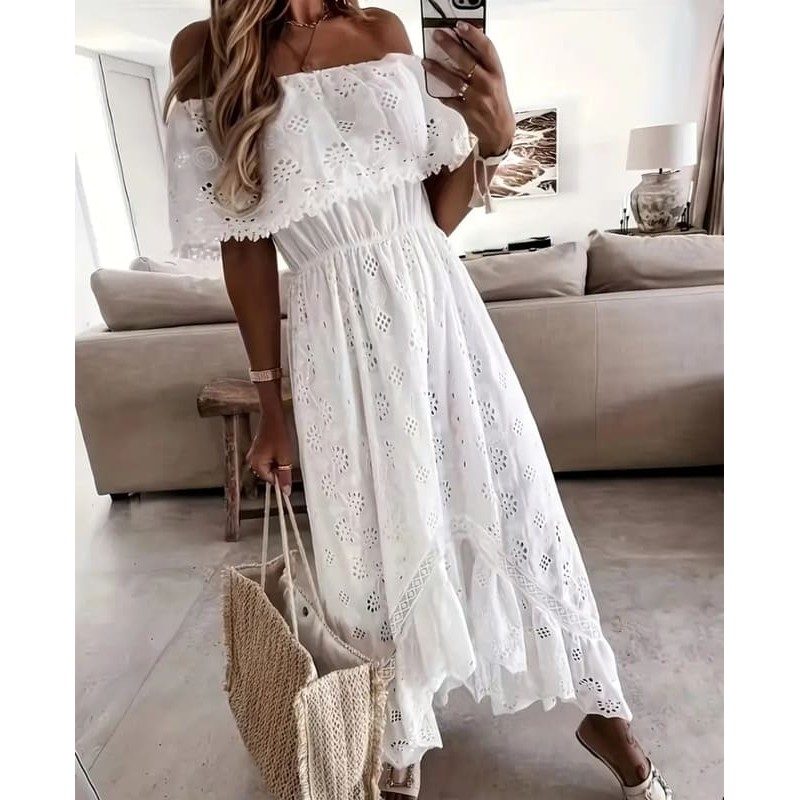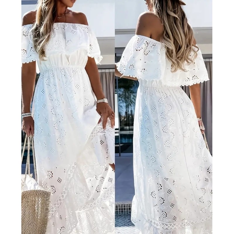 - лятна бяла рокля с отворени рамене и волан от бродирана материя тип английска дантела
