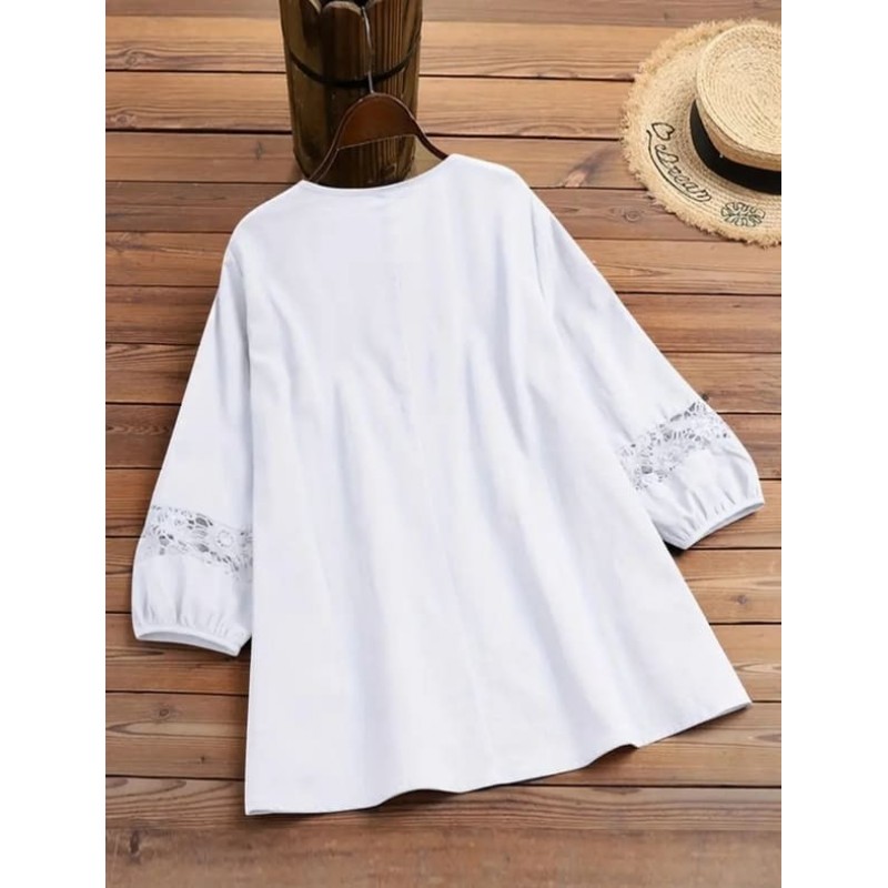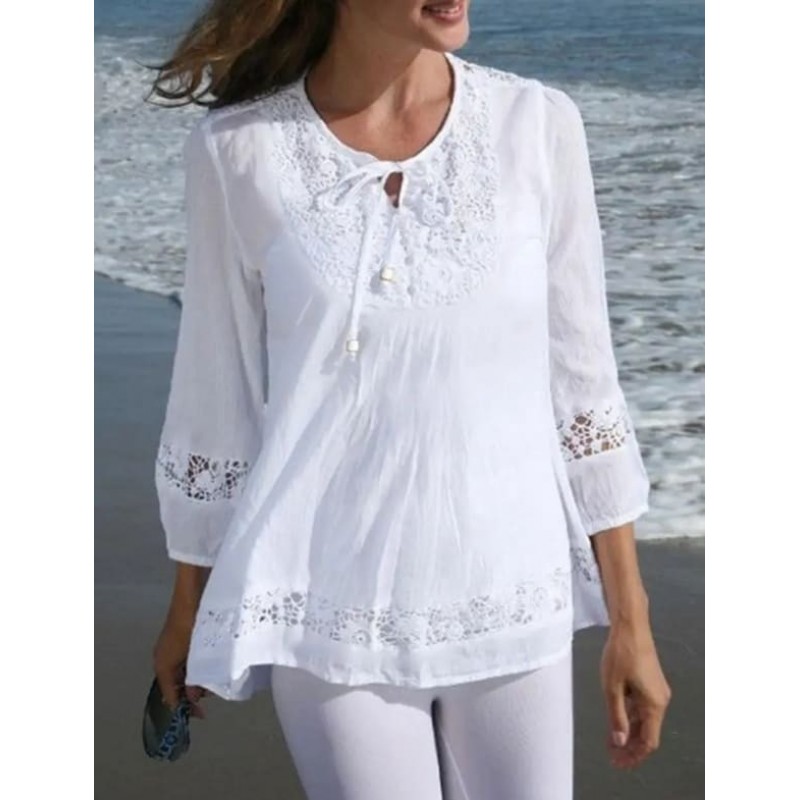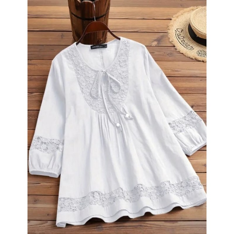 Бяла туника с връзка и дантела с три-четвърти ръкави