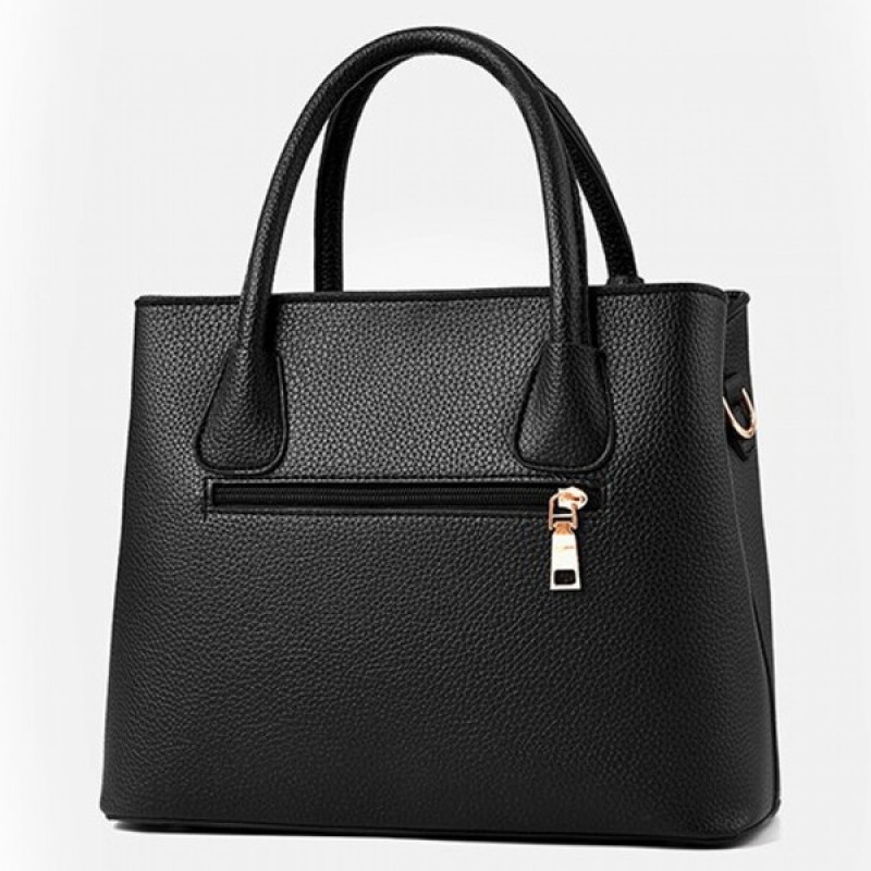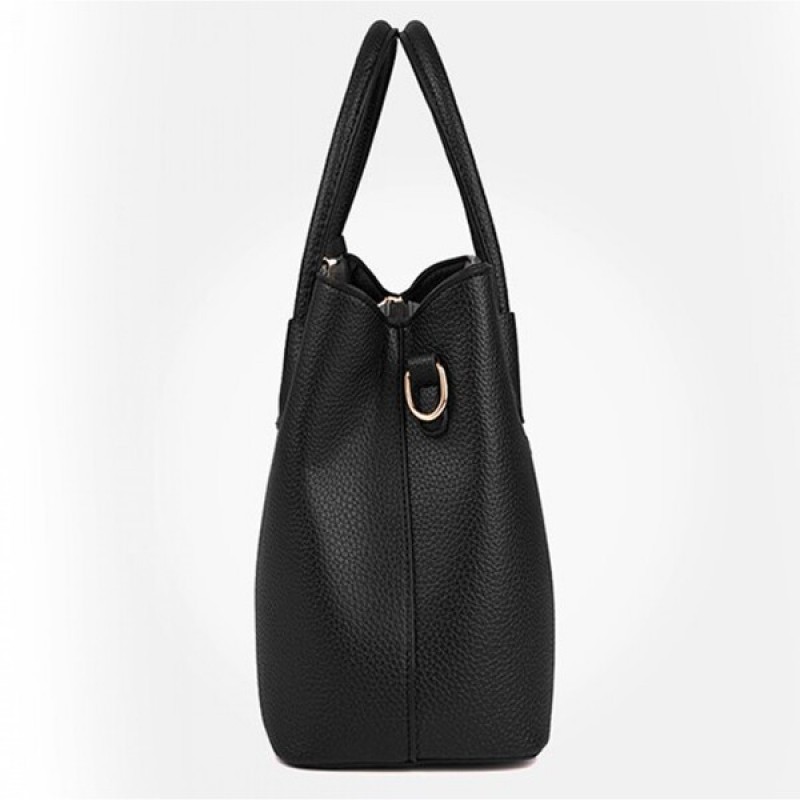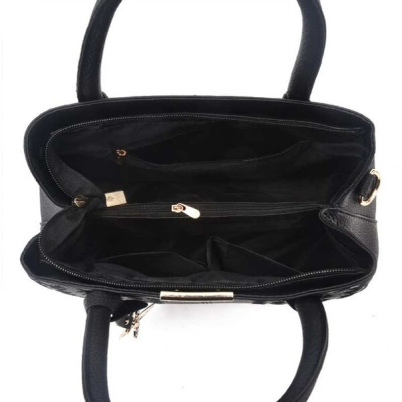 Дамска черна чанта от еко-кожа с две дръжки и дълга дръжка за през рамото.