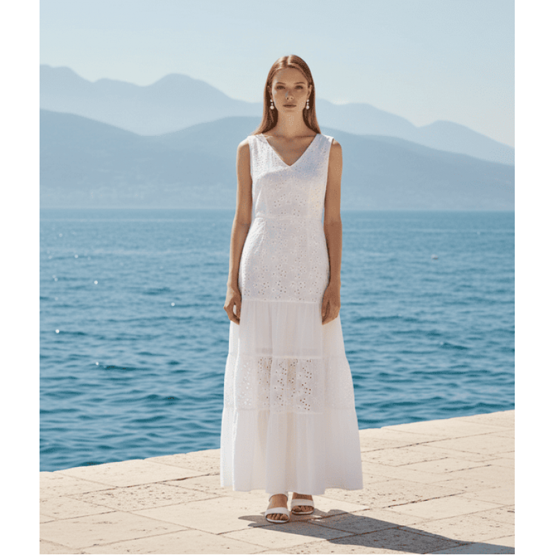 - бяла дълга рокля за лятото без ръкав от памучна материя с рязана бродерия
