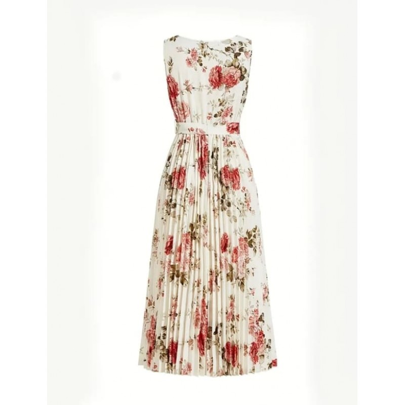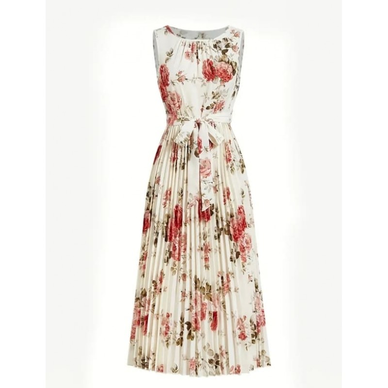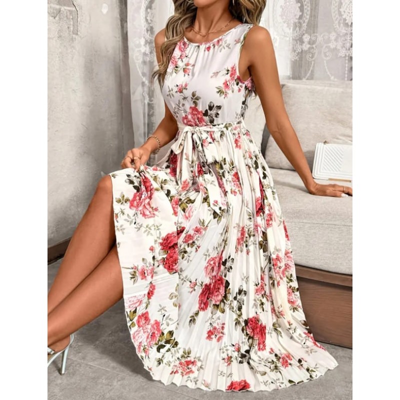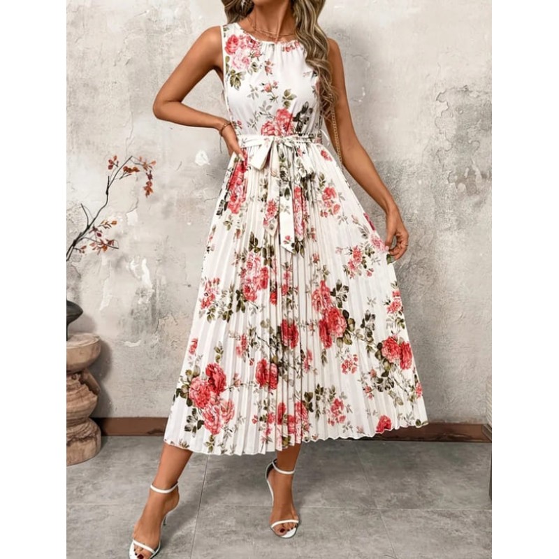 - лятна бяла рокля без ръкав на цветя с пола солей и колан от плата