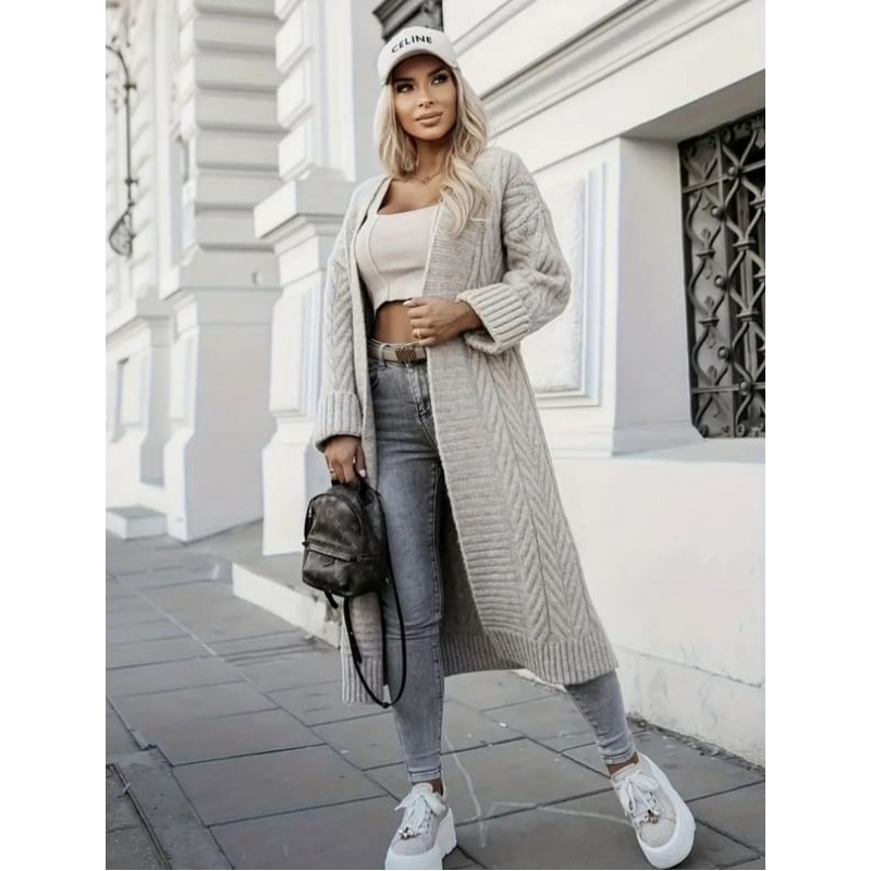 Дълга светлокафява жилетка с плетеници