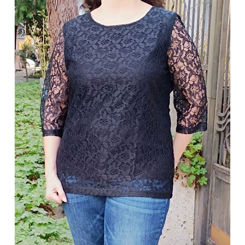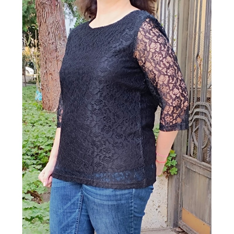 - дамска блуза от черна дантела с черна трикотажна основа, подходяща и за по-официален повод