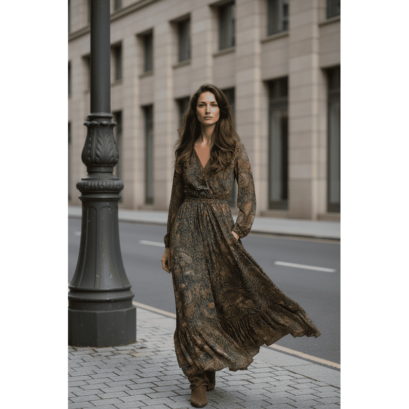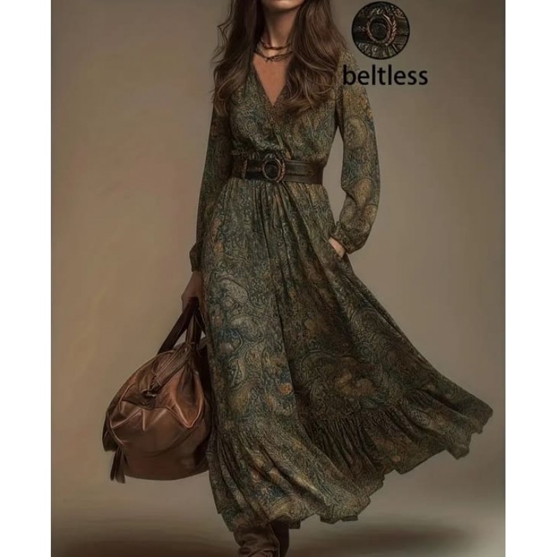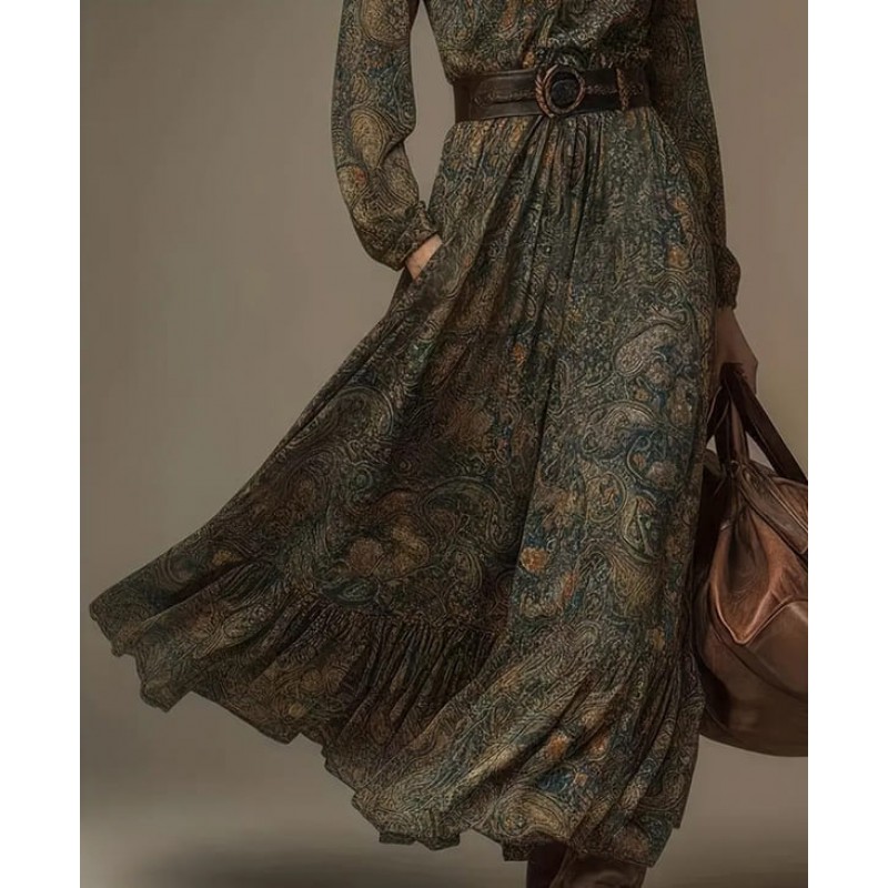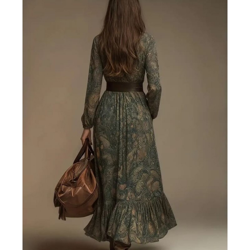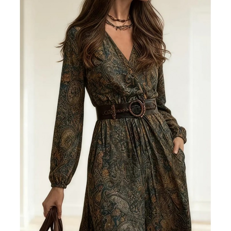 Дамска рокля с щампа пейсли разкроен модел с дълъг ръкав