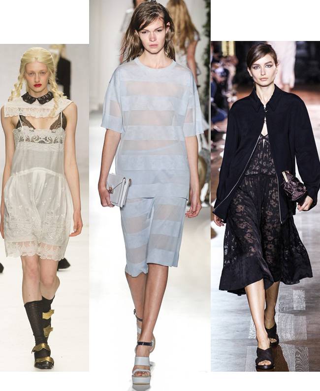 За топлото и горещо лято са модерни топове, поли и рокли от леки, въздушни или „летящи” материи. Този сезон те са полупрозрачни: органза, шифон, все още много дантела и муселин. Модерни са и роклите, които имат прозрачни детайли на гърба, отпред или на раменете.