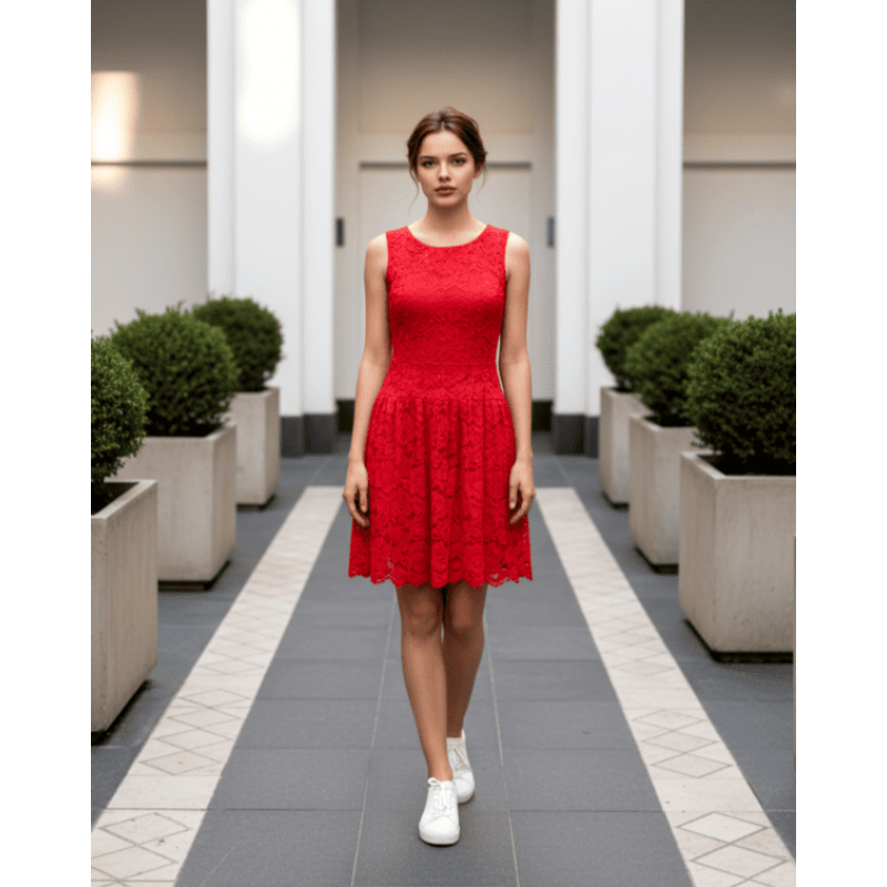 Красива червена рокля от дантела за лятно парти или вечеря.Етикети: лятна рокля, дантелена рокля, червена рокля, официална рокля, дамска дантелена рокля