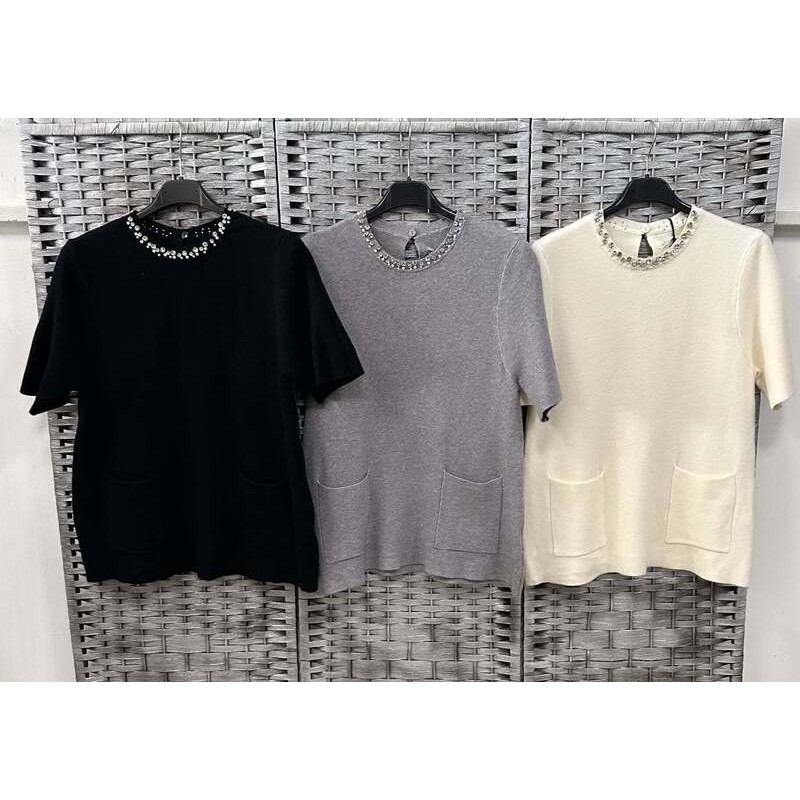 Едноцветна плетена блуза с къс ръкав и бели камъни