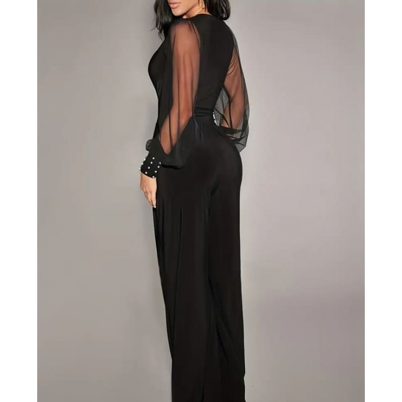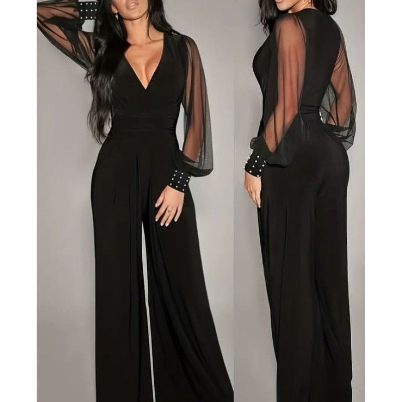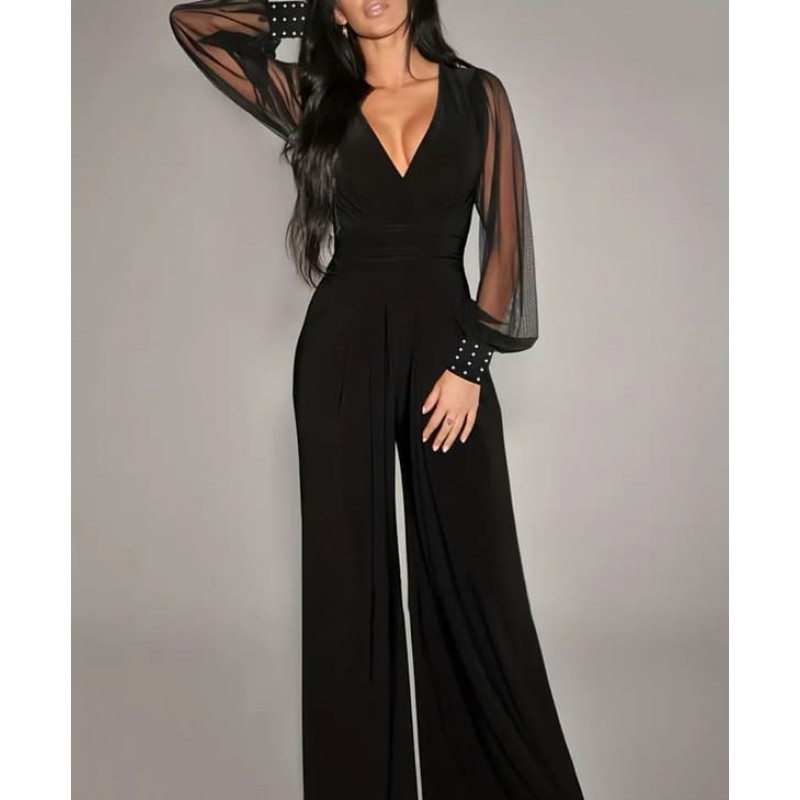 - дамски официален гащеризон с остро деколте и ръкави от тюл