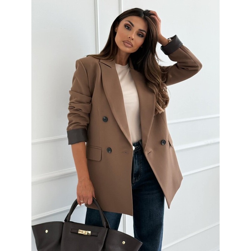 - дамско модерно кафяво сако с двуредно закопчаване, 7/8 ръкави и черни маншети от стреч-кожа