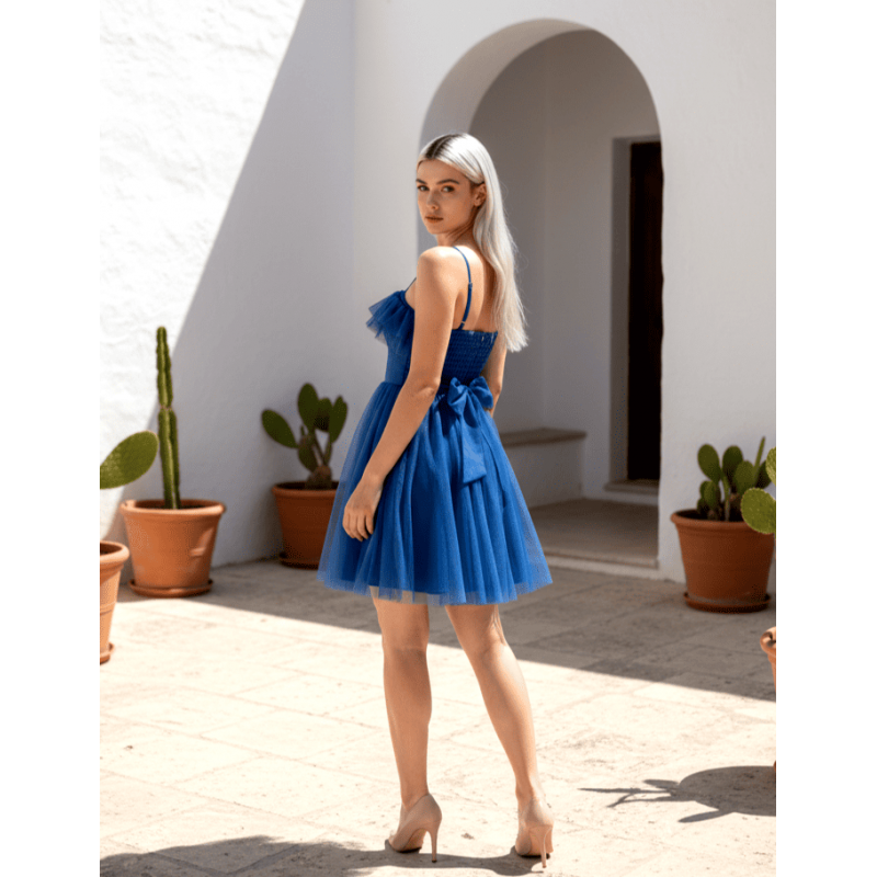 Етикети: дамска рокля, официална рокля, кралскосиня рокля, тюлена рокля, къса рокля, вечерна рокля