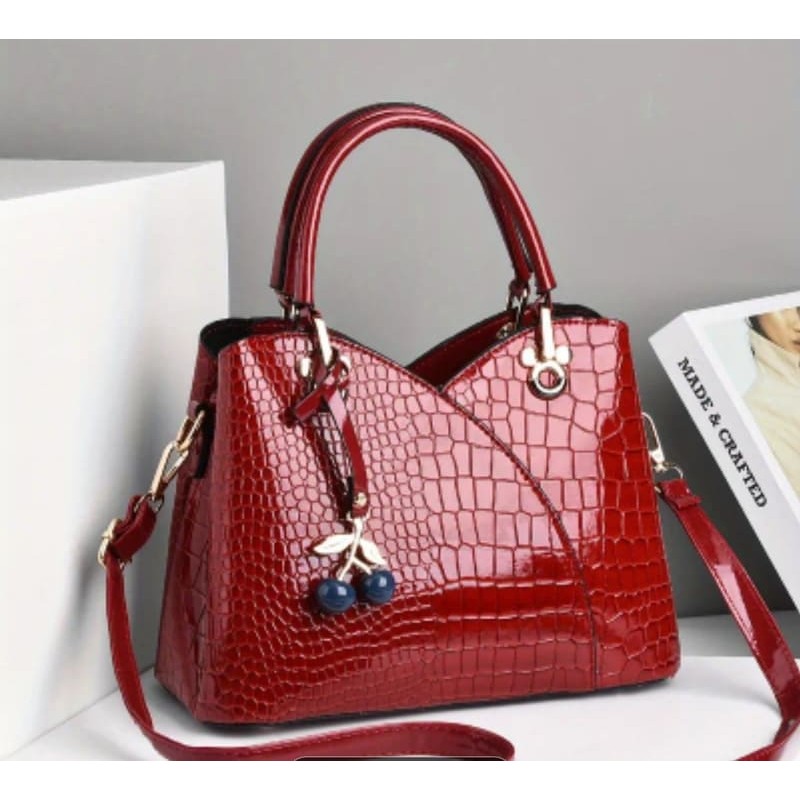 Лачена червена чанта среден размер с две дръжки и дълга дръжка