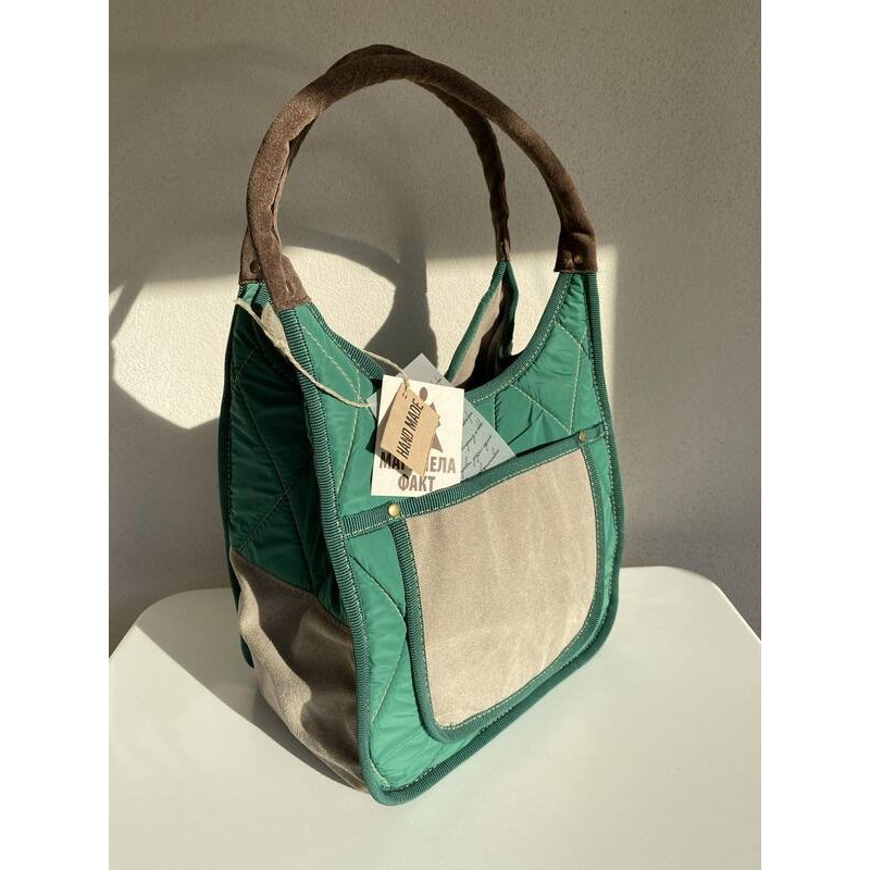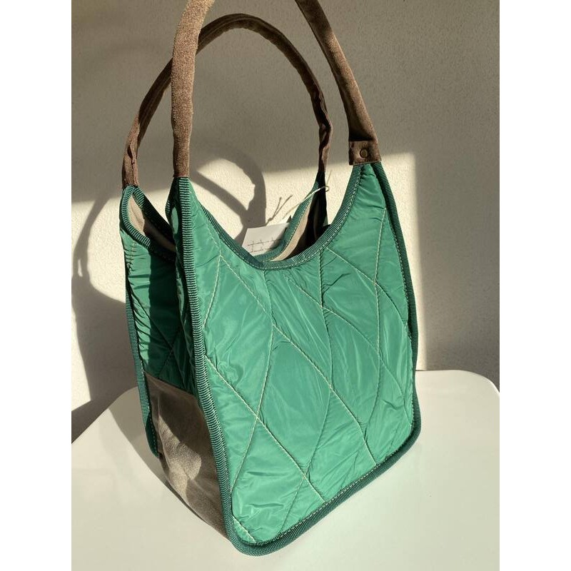 - уникална лятна чанта съчетание на ленена материя с капитониран плат в зелено