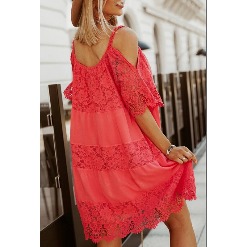 Лятна рокля стил бохо с дантела, тънки презрамки и отворени рамене.