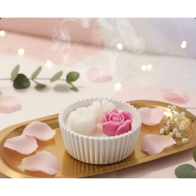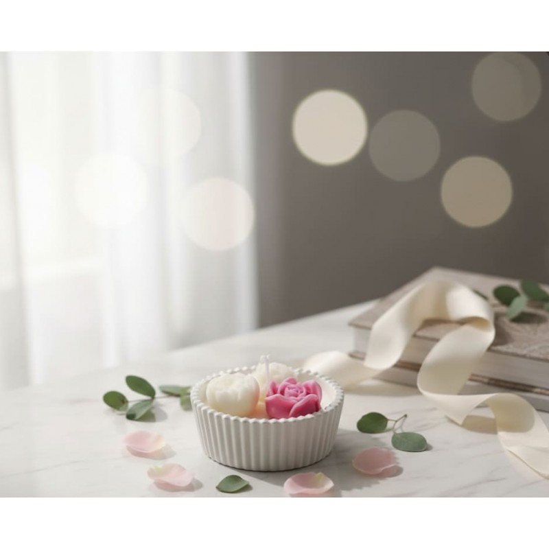 - ръчно изработени соеви рози аранжирани в гипсова кашпа с памучен фитил в центъра