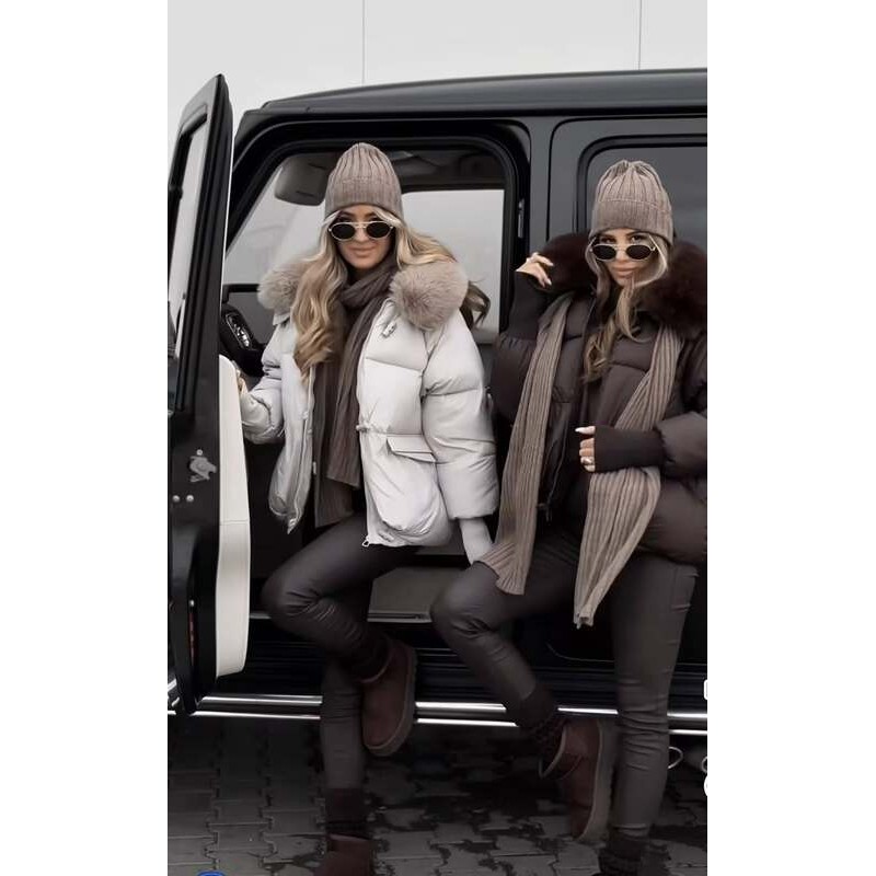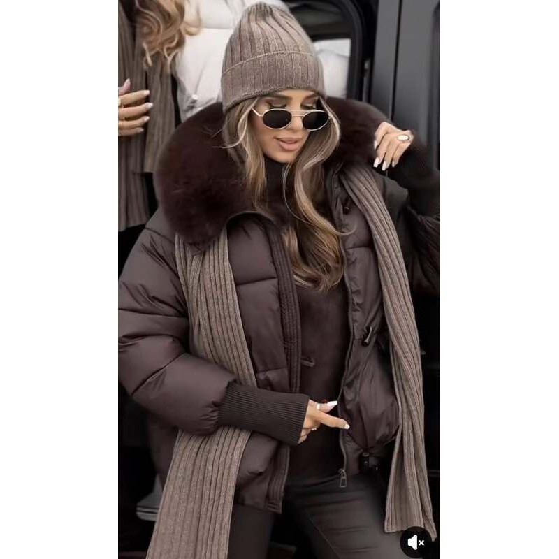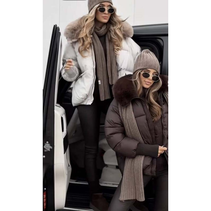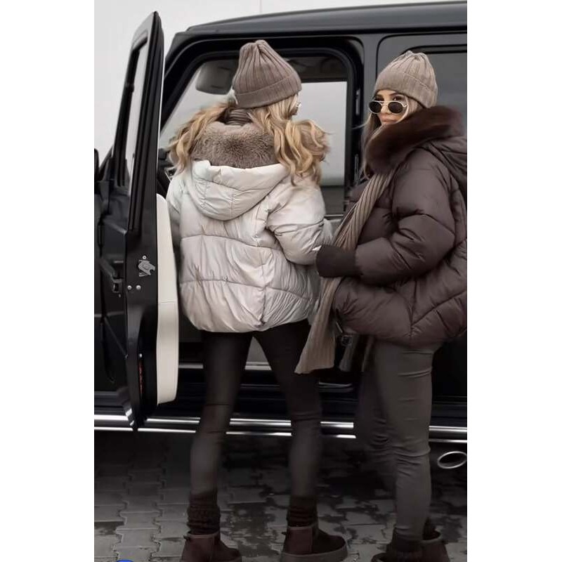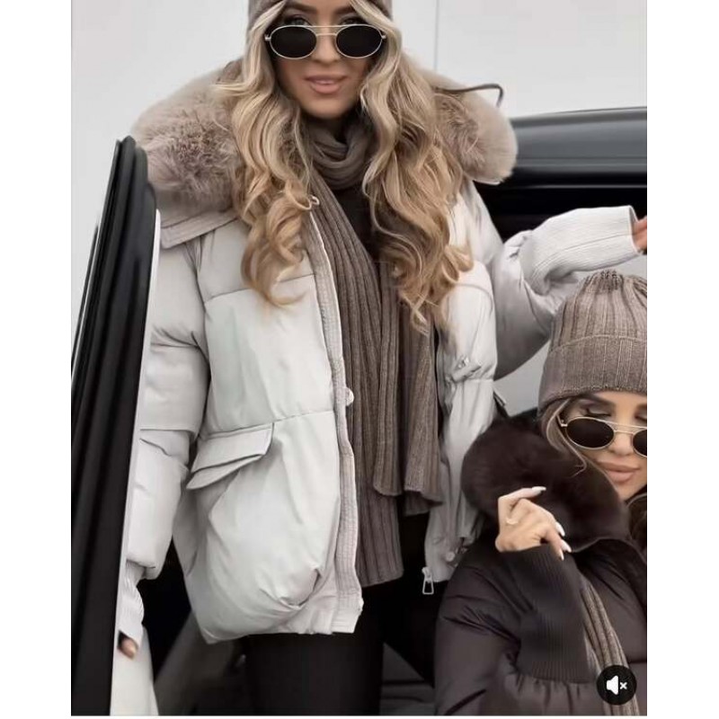 - дамско пухено зимно яке в модерните цветове бежово и кафяво с ластичен плетен маншет