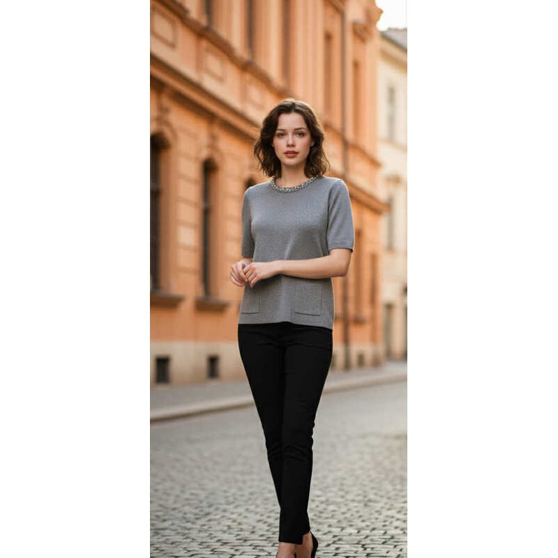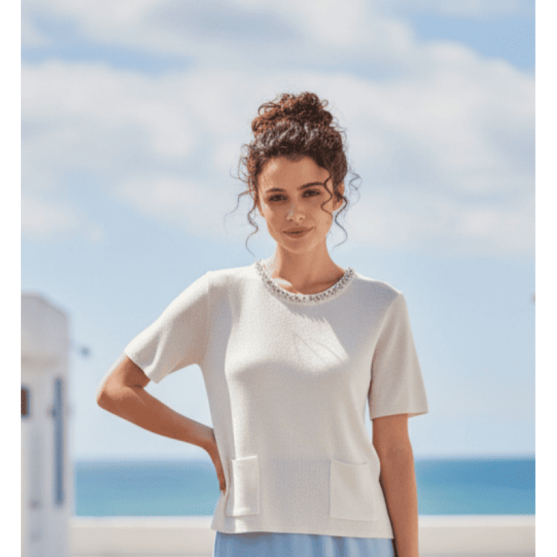 Едноцветна плетена блуза с къс ръкав и бели камъни