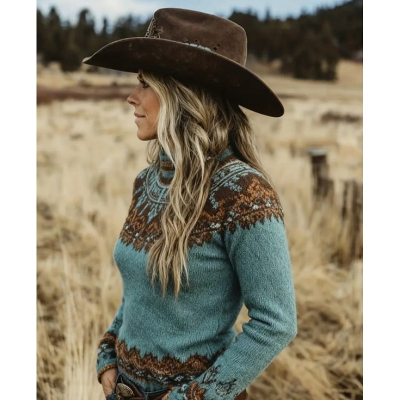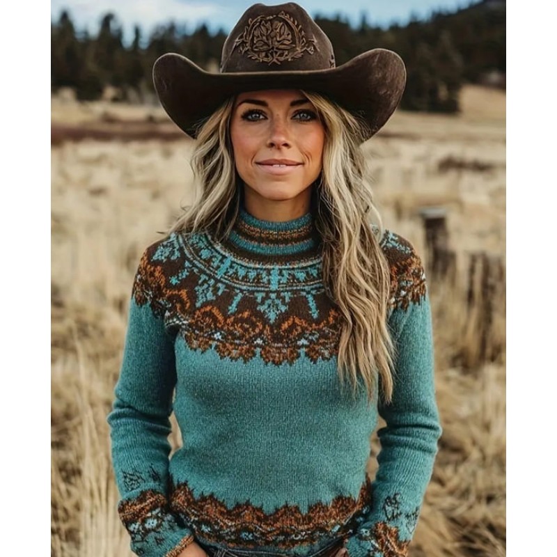 - дамски плетен пуловер около врата с шарка в скандинавски стил