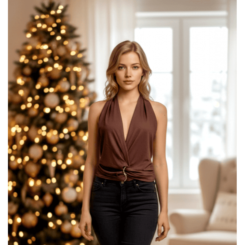 - дамски кафяв топ с открит гръб с кръстосани ленти и катарама-брошка с бели камъни