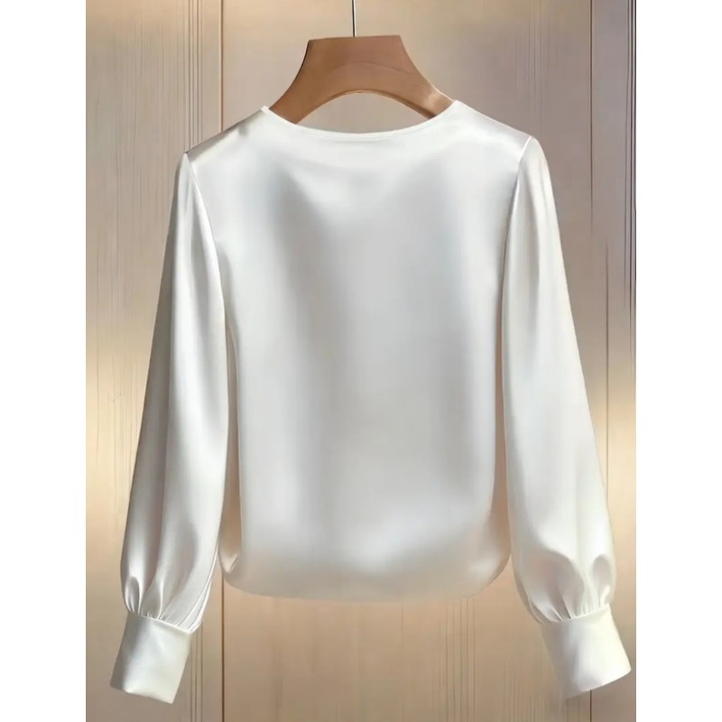 - дамска риза от сатен с обло деколте, изчистен модел с перли около деколтето отпред