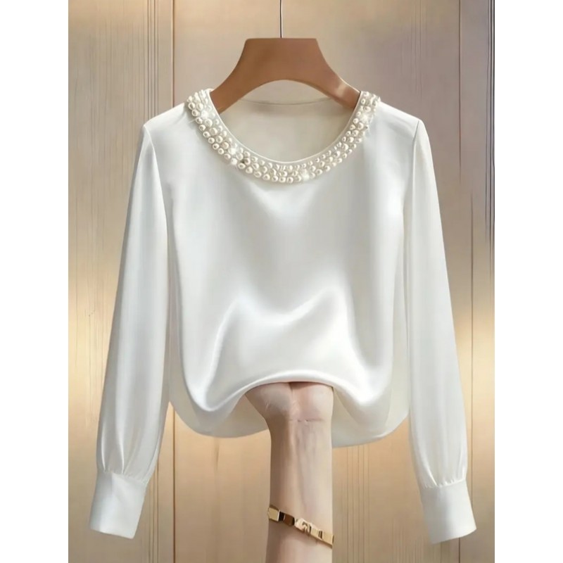 Етикети: сатенена блуза, бяла блуза, блуза с перли, официална блуза