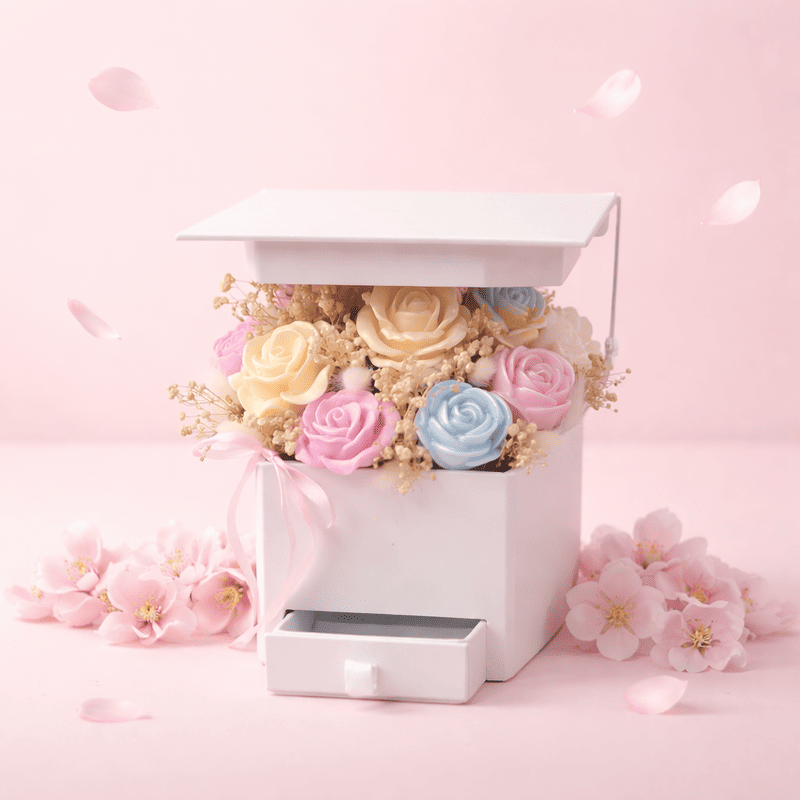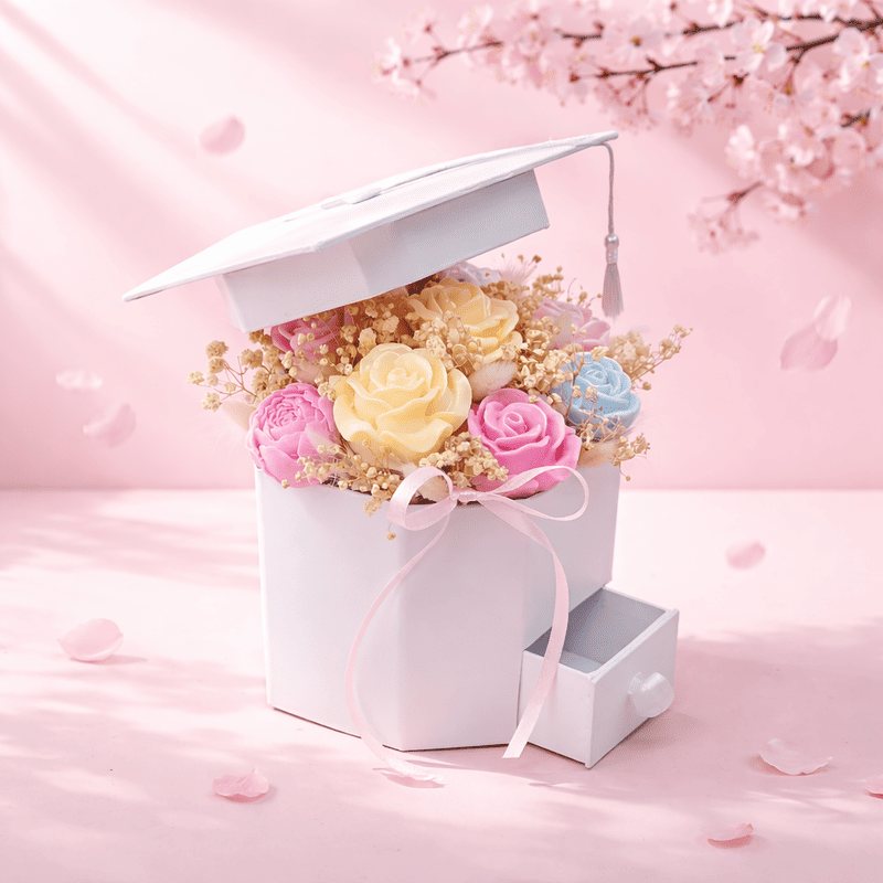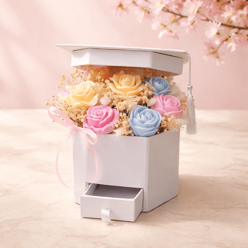 Абитуриентски восъчен букет в кутия с чекмеджеРазмер широчина 14 см на кутията, височина 23 см на бу..