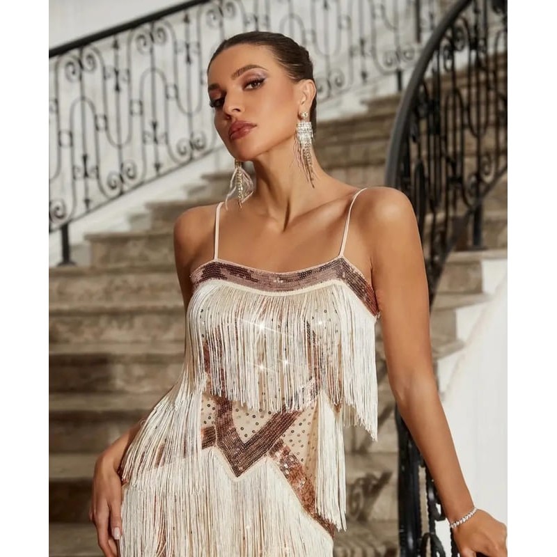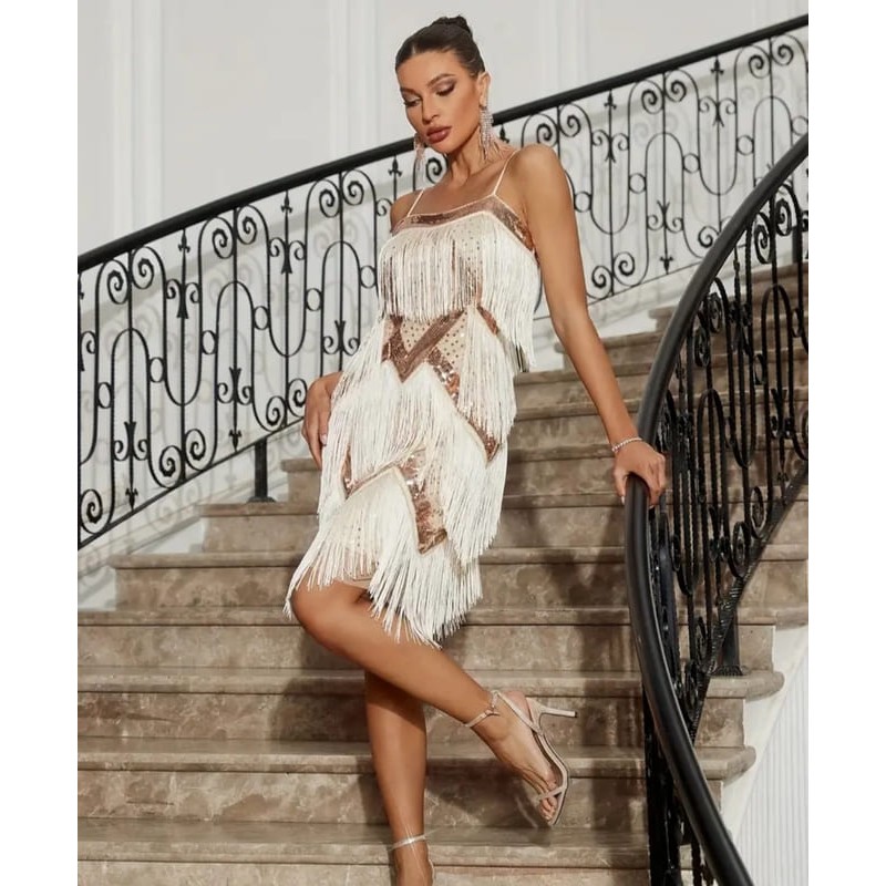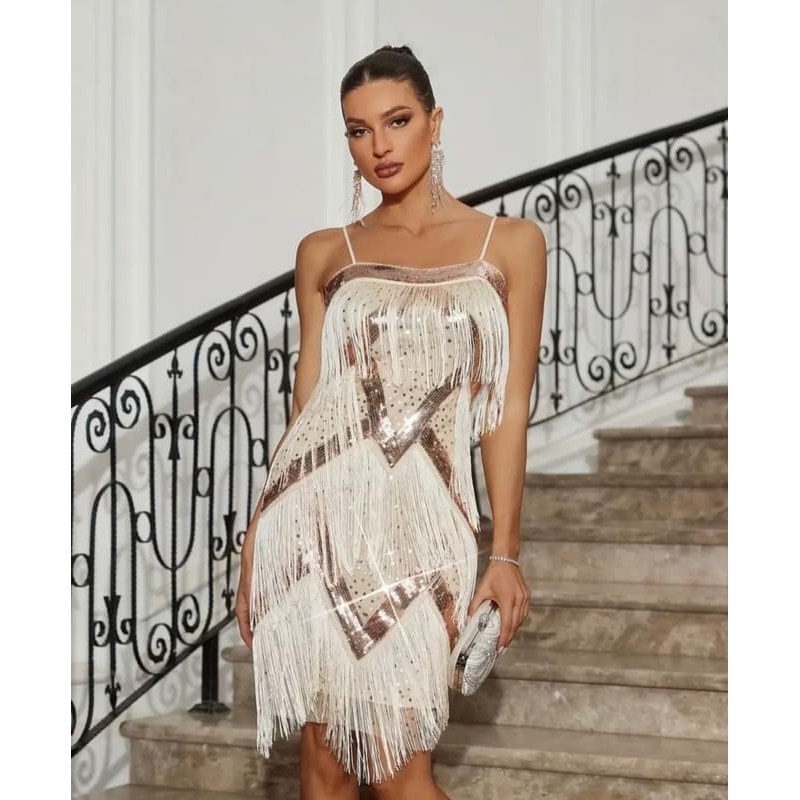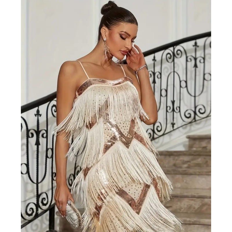 - уникална и запомняща се рокля с пайети и ресни в духа на 20-те г. на миналия век